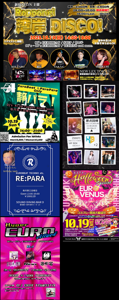 ■Roppongi 湾岸DISCO!~オープン2時間飲み放題! ■Sunday Euro Paradise ■GO GO FIRE ■SEF ■静パラ! ■原点回帰 ■Re:Para ■芋パラ ■Hyper EURO Attack ■EURO VENUS