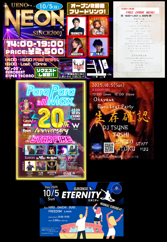 ■NEON~オープン2時間飲み放題! ■MAGICAL RAVE HYPER ■#ロクパラ ■【20周年】Para Para Max ■ETERNITY ■桃のヨゴレ ■SUNDAY DISCO TowaIto ■生存確認